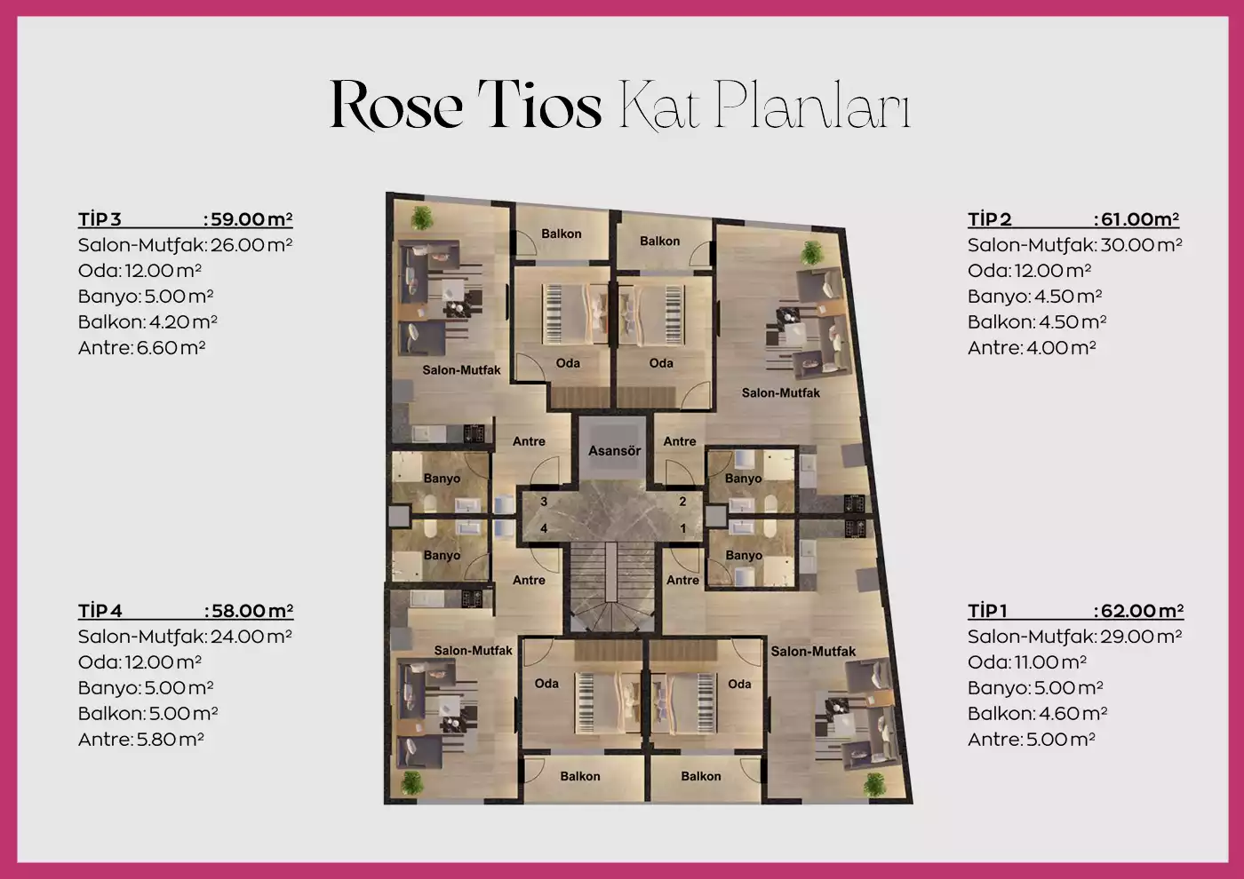 Kat planlarında yer alan tüm daireler; fonksiyonel yerleşim, dengeli metrekare dağılımı ve günlük yaşam ihtiyaçlarına uygun çözümler sunacak şekilde tasarlanmıştır. Rose Tios’ta her detay, konforlu ve sürdürülebilir bir yaşam anlayışı doğrultusunda ele alınmıştır.